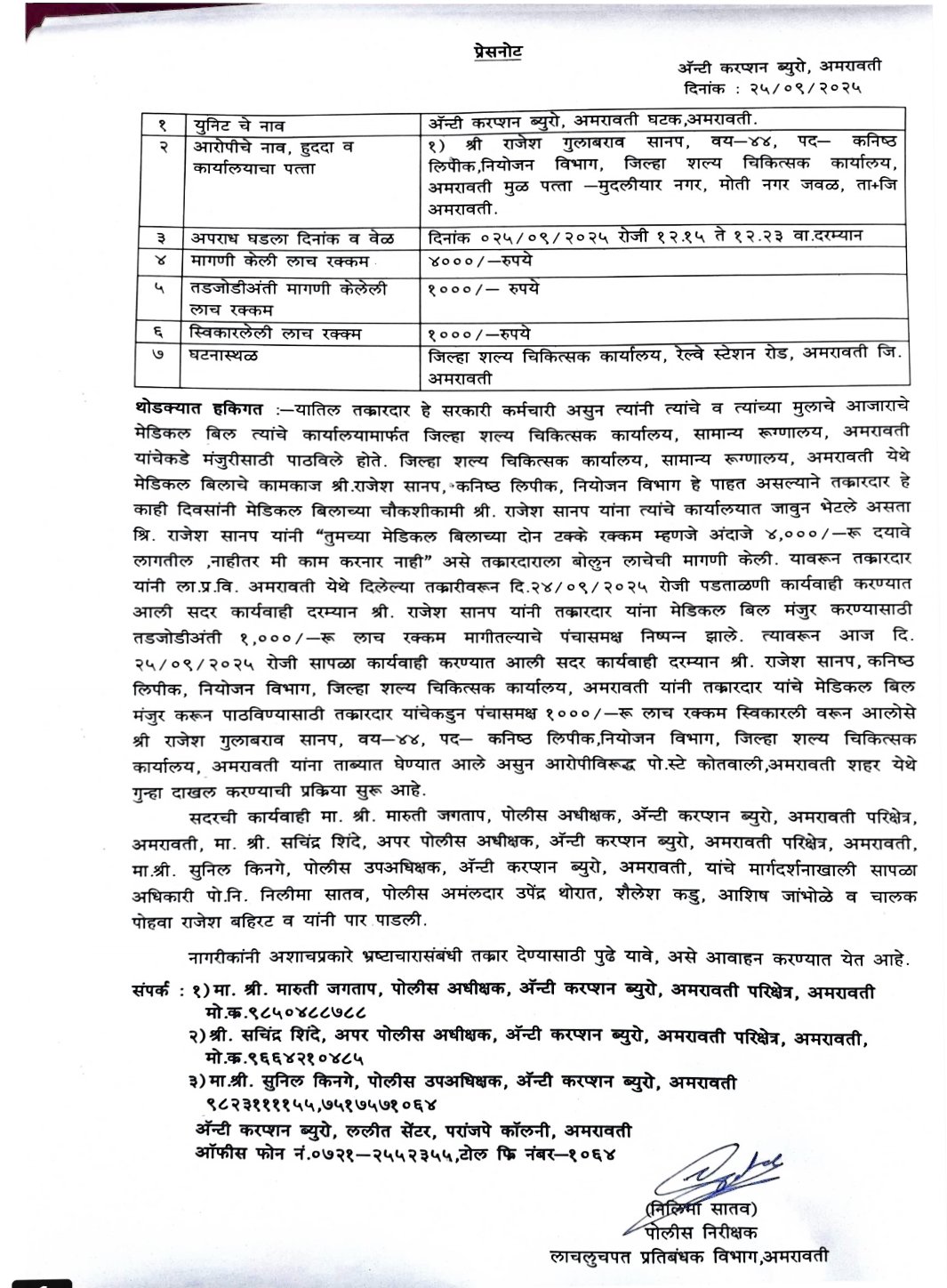 Press Release - CR 359/2025, U/S 7 OF P C ACT 1988, PS CITY KOTWALI, AMRAVATI CITY Uploaded By Amravati from Amravati