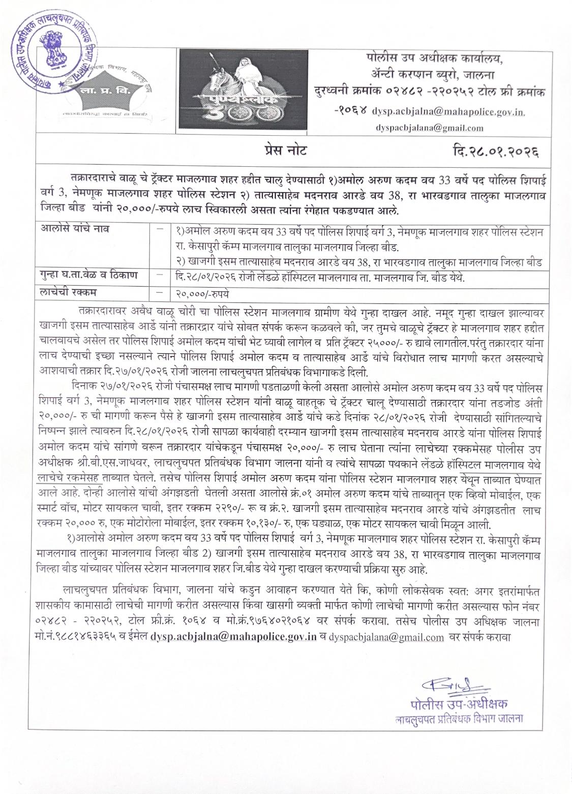 District HingoliPolice Station Hingoli City C. R. No 05/2026 U/S 7 P.C.Act 1988 |