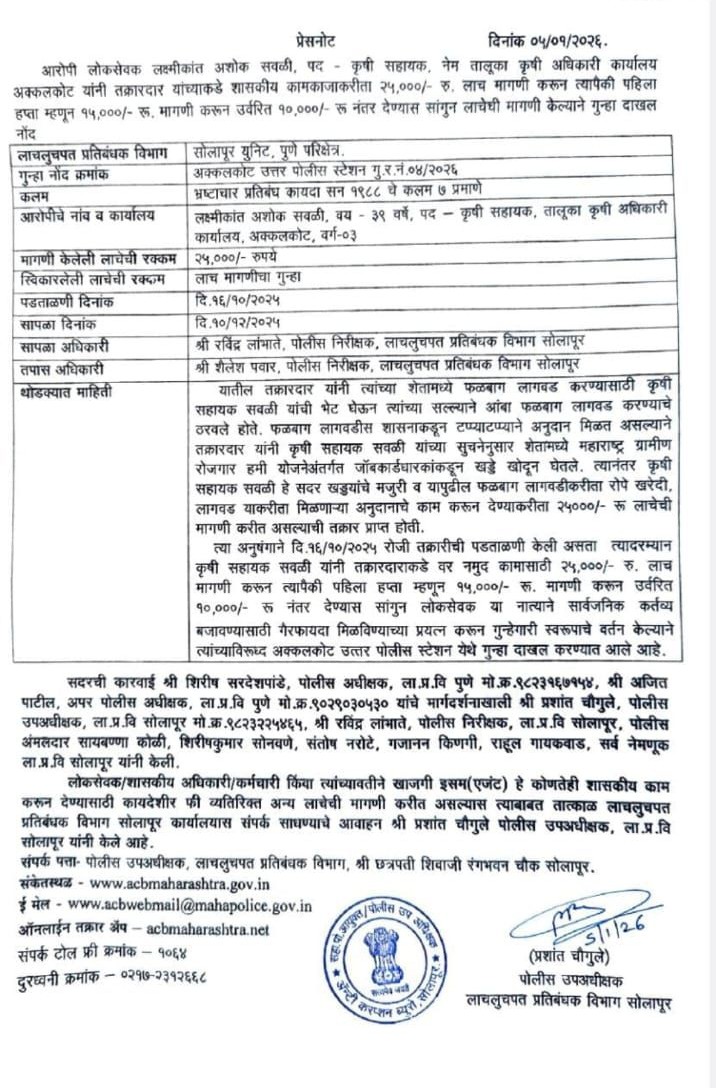 Press Release Madrup PS, Solapur Rural CR. No. 460-2025, Prevention of Corruption Act, 1988 Section 7, 7A, 12 |
