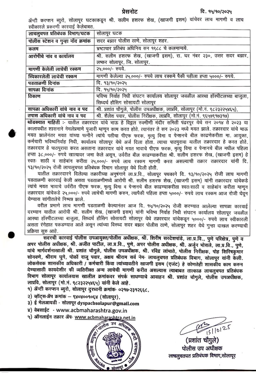 Press Release - Sadar Bazar PS, Solapur City CR. No. 817/2025, Prevention of Corruption Act, 1988 Section 7A Uploaded By Solapur from Pune