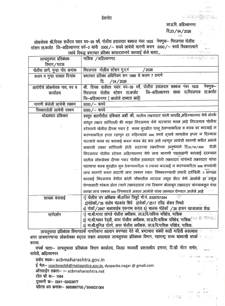 Press Release - Shanipeth PS Cr No 79/2026 U/S 7 PC Act Uploaded By Jalgaon from Nashik