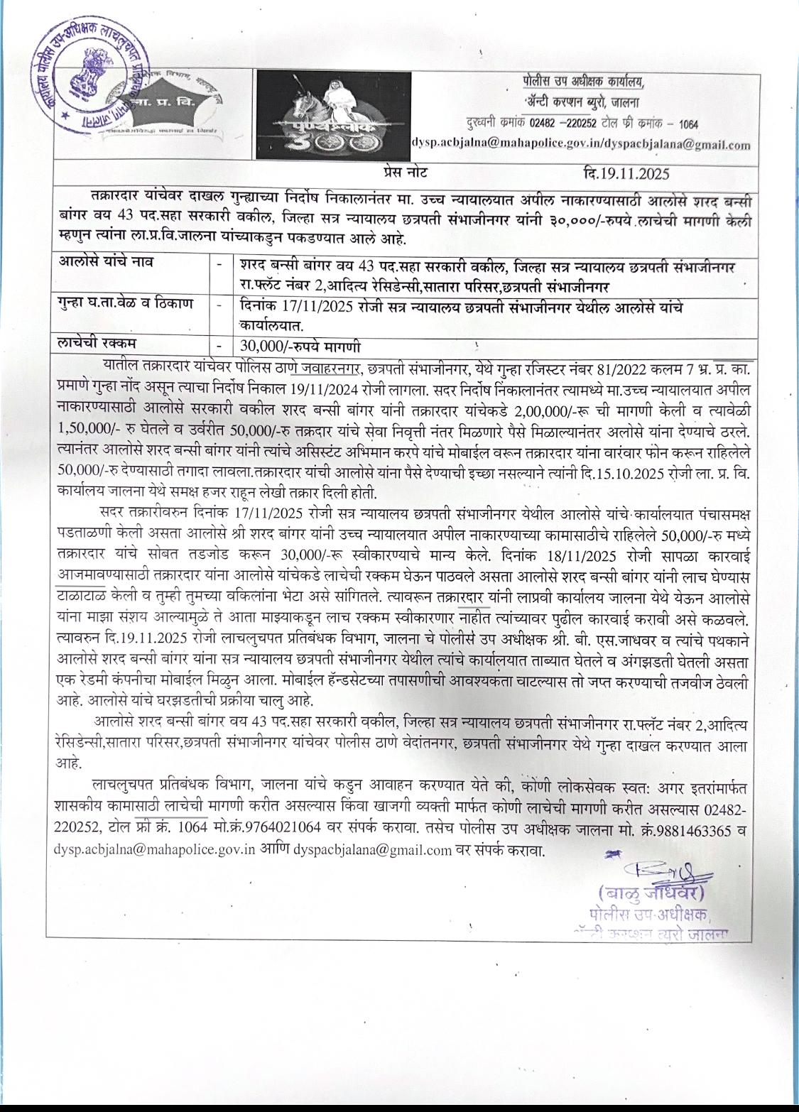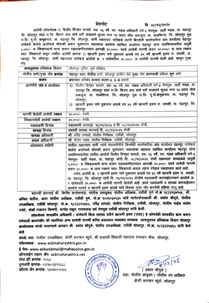 Jodbhavi Peth PS, Solapur City CR. No. 794/2025, Prevention of Corruption Act, 1988 Section 7 Press Note |